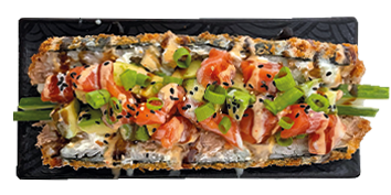 frittierter Reissandwich mit Gurke, Avocado & frische Lachswürfel mit hausgemachter Sauce